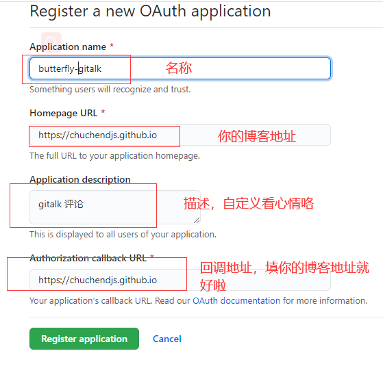 Gitalk 需要一个 Github Application,点击这里: 创建应用