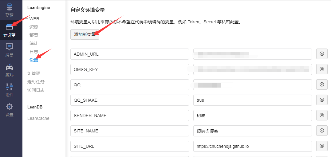 在LeanCloud 应用部署项目,并且配置云引擎变量