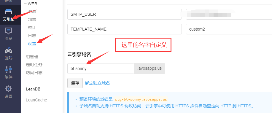 点击设置->域名绑定->云引擎域名绑定国际版(建议使用这个)